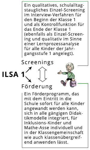 ILSA erhebt und dokumentiert den individuellen Lernstand von Kindern zu Beginn der ersten Klasse, gibt LehrerInnen Förderempfehlungen, stellt Fördermaterialien bereit und erlaubt über ein PC- gestütztes, qualitatives Protokollprogramm eine individualisierte Zusammenstellung von Einzelfördergruppen im und natürlich auch außerhalb des Klassenverbandes bei allen Kindern - und dies auch über die erste Klasse hinaus.